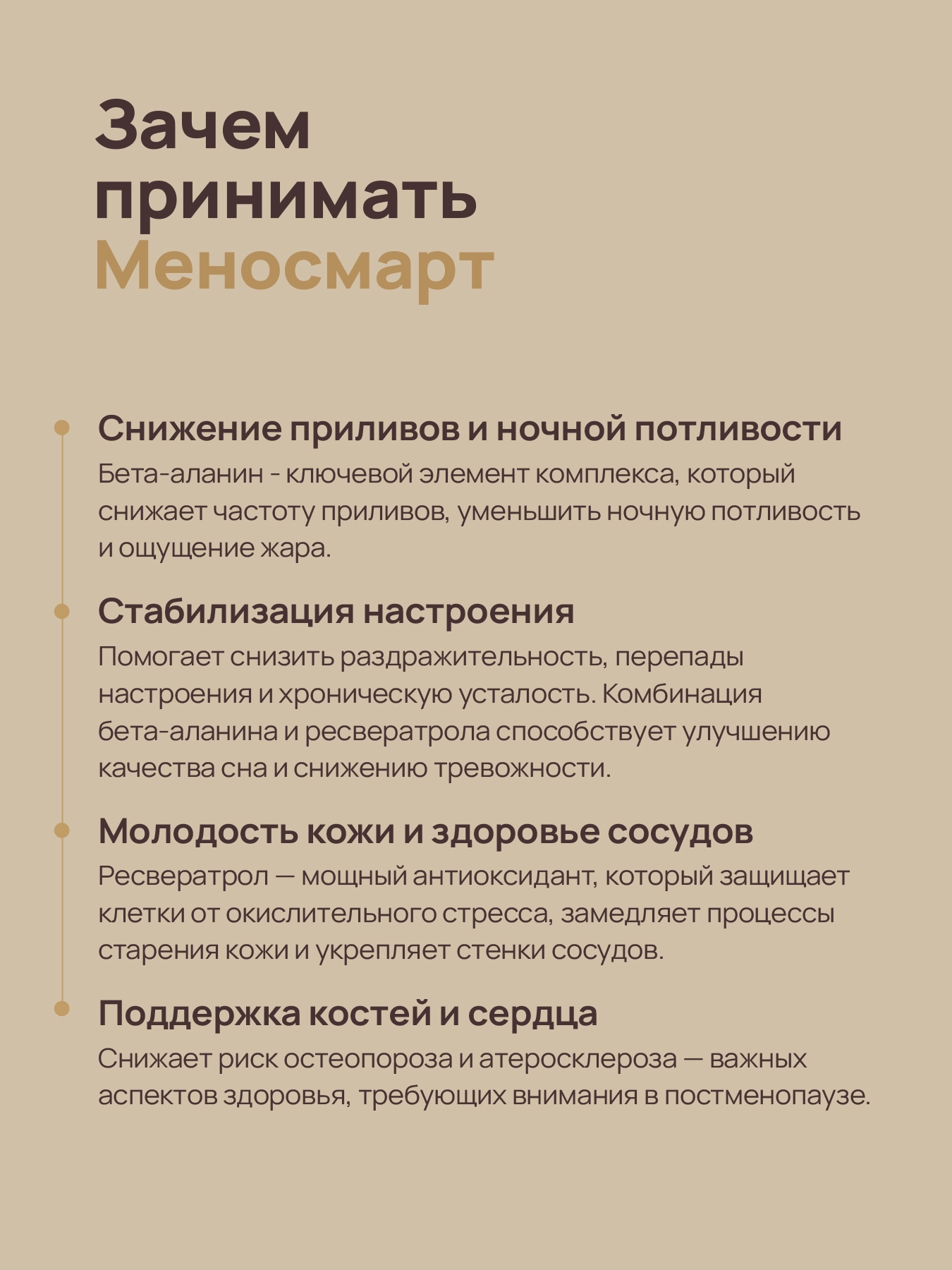 Снижает риск остеопороза и атеросклероза — важных аспектов здоровья, требующих внимания в постменопаузе.