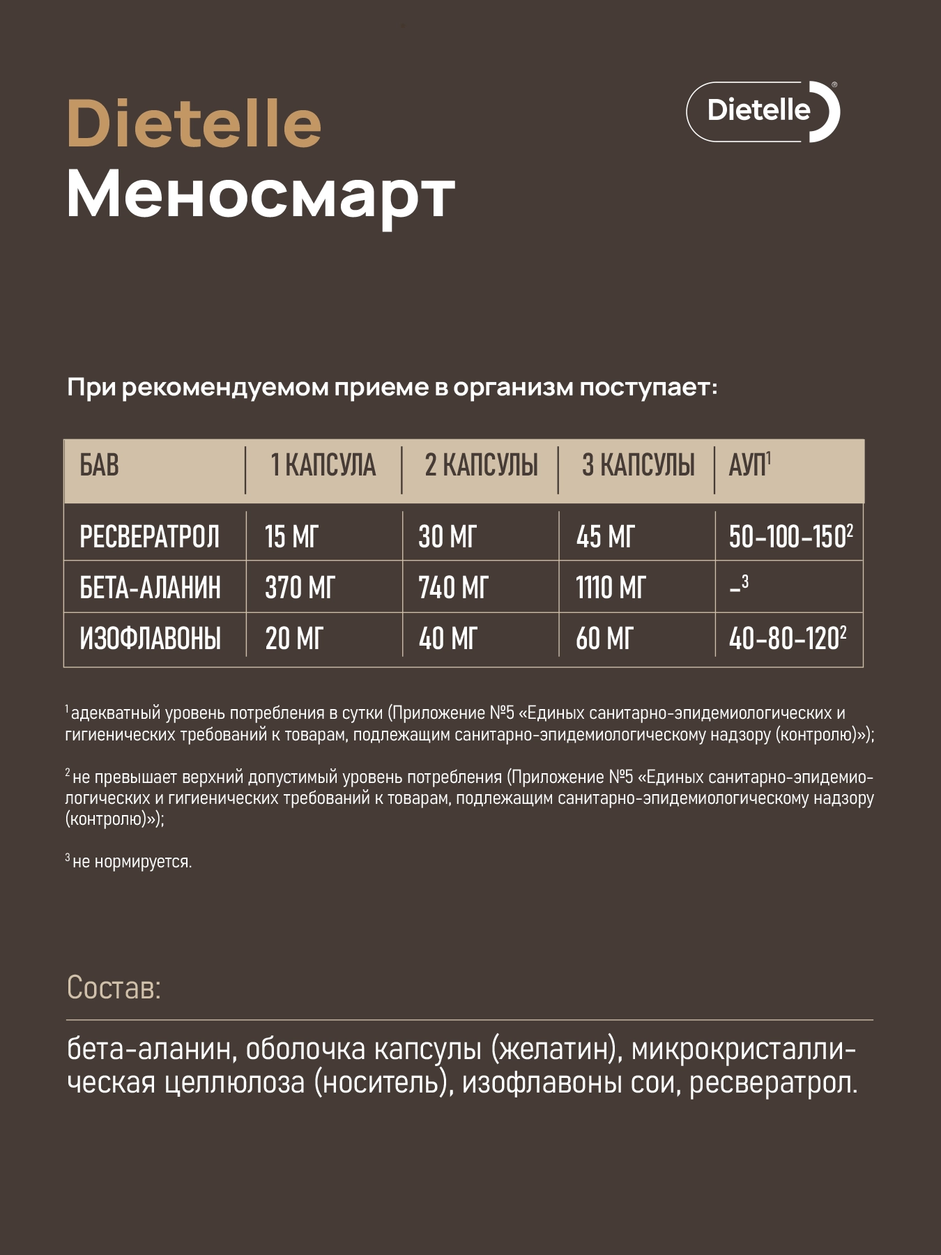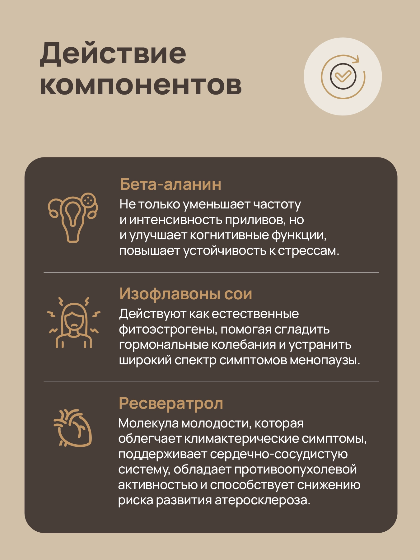 Бета-аланин - ключевой элемент комплекса, снижает частоту приливов, помогает уменьшить ночную потливость и ощущение жара.