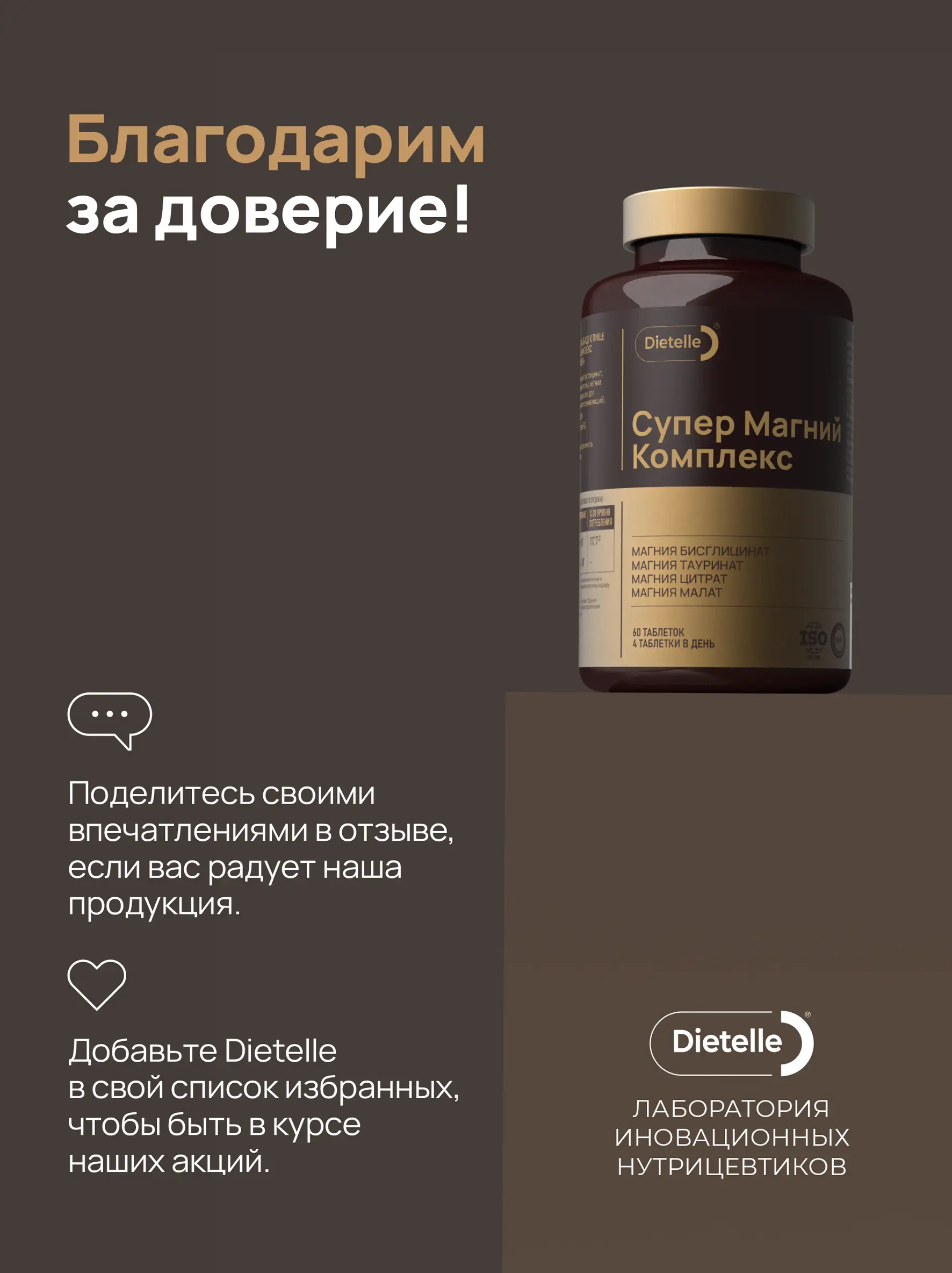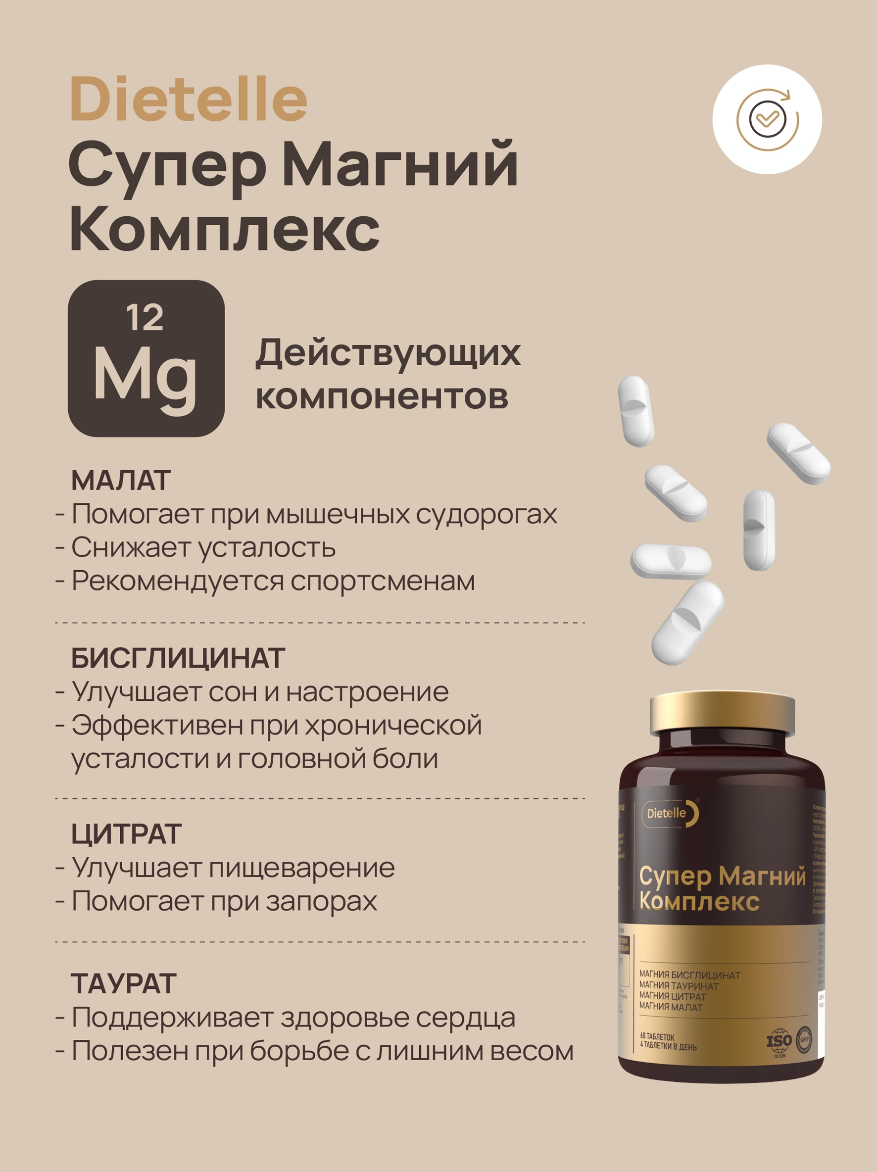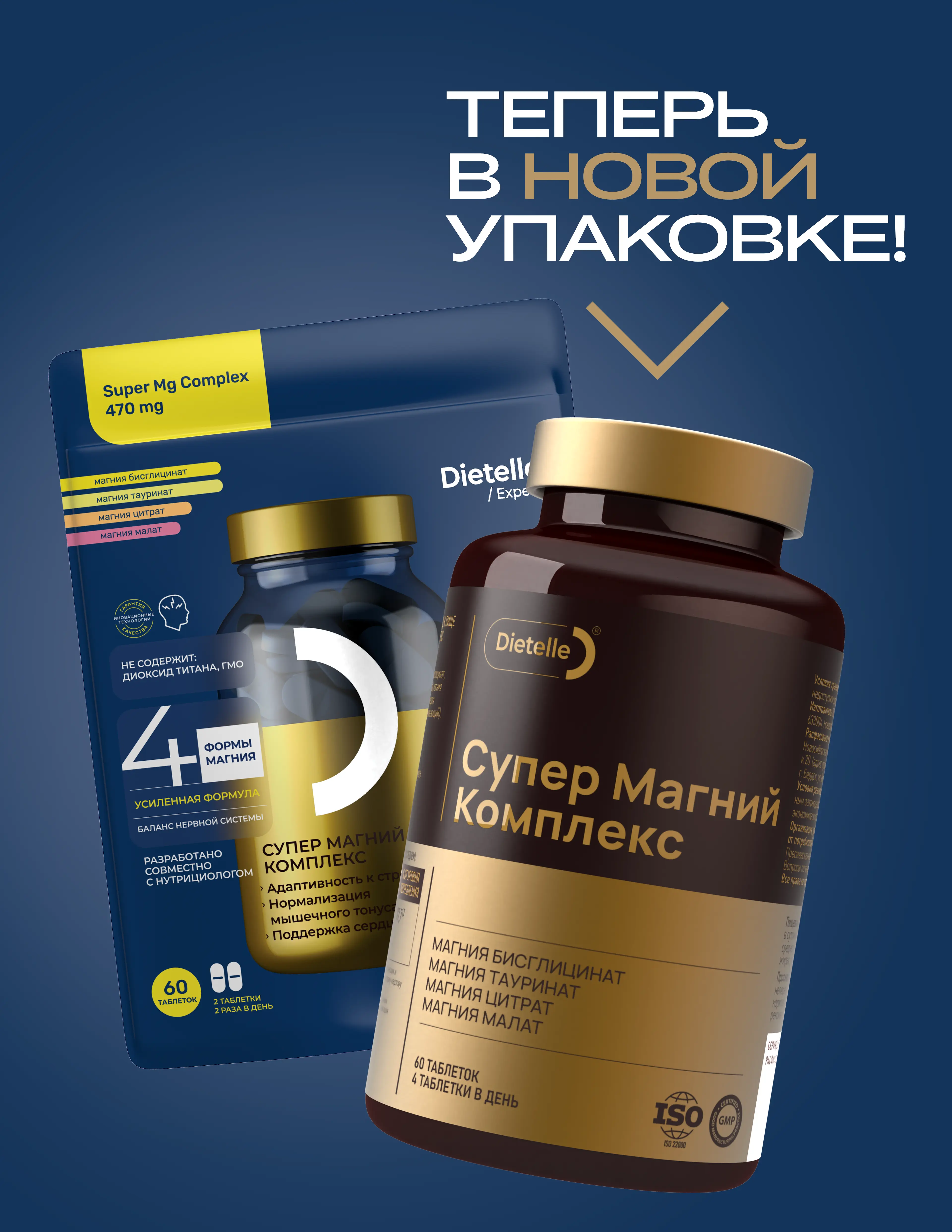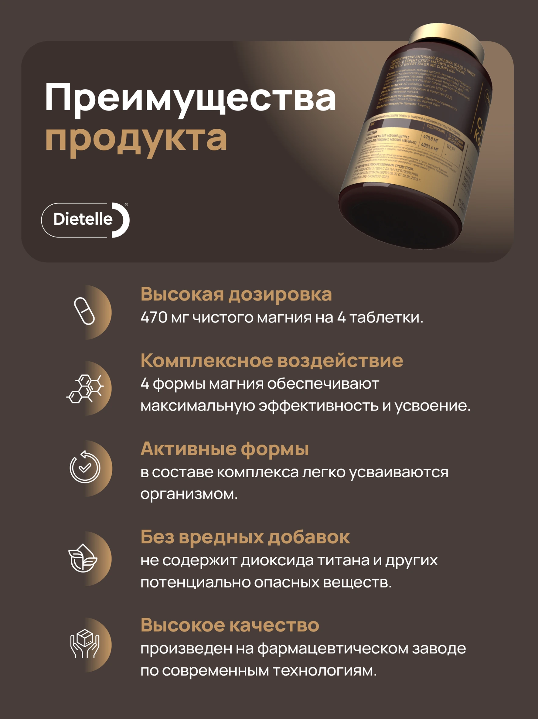 DIETELLE Супер Магний — это синергетический комплекс из 4 биодоступных форм магния, каждая из которых работает на своём уровне, обеспечивая комплексное восстановление: