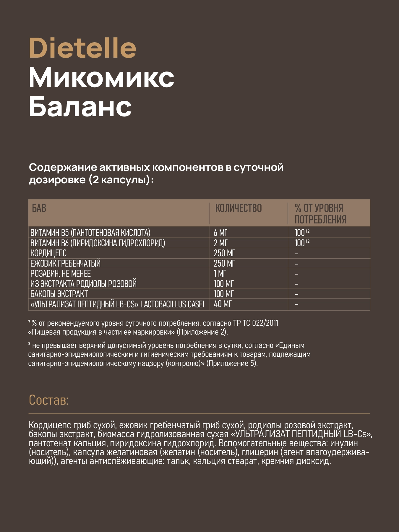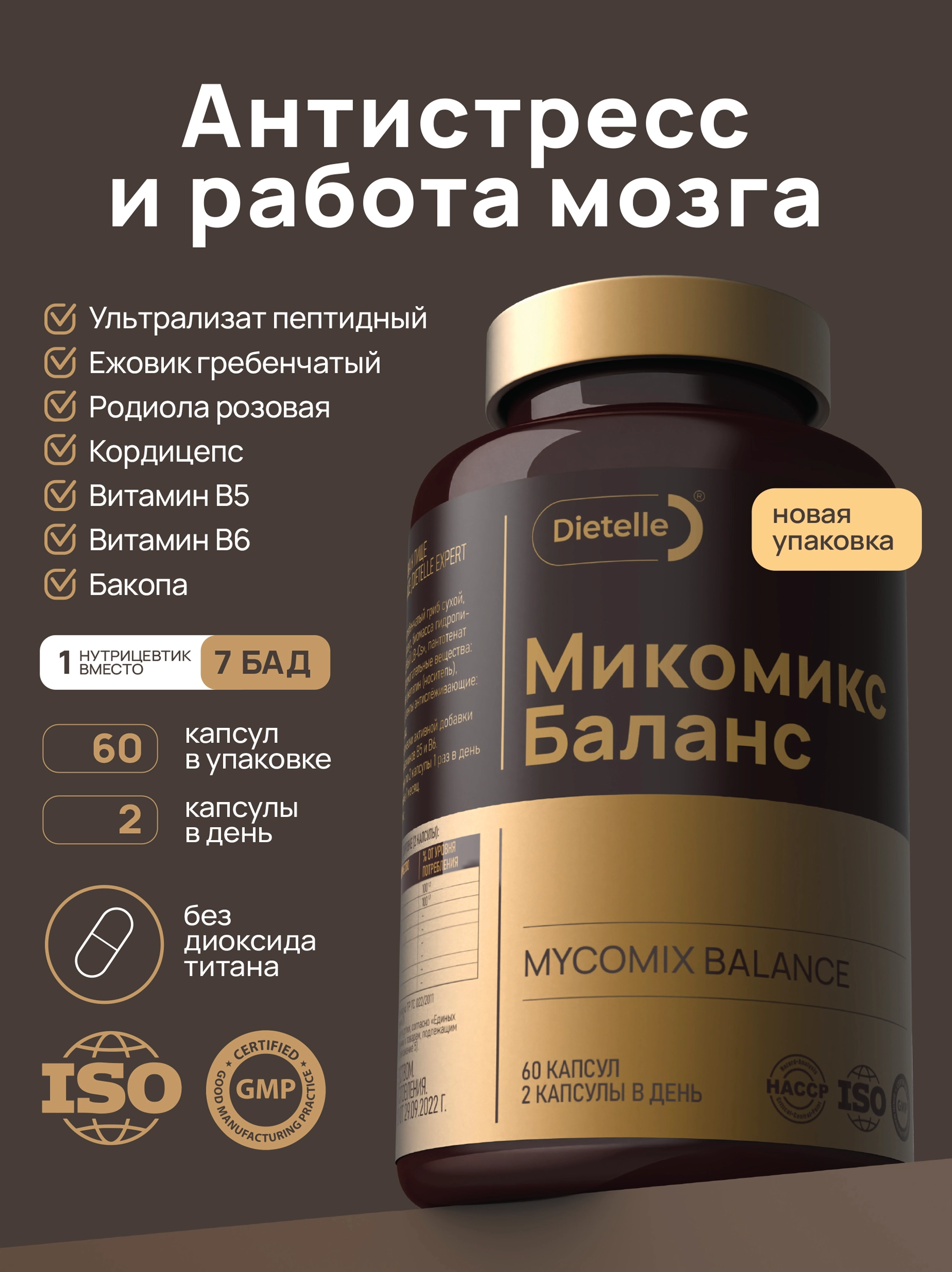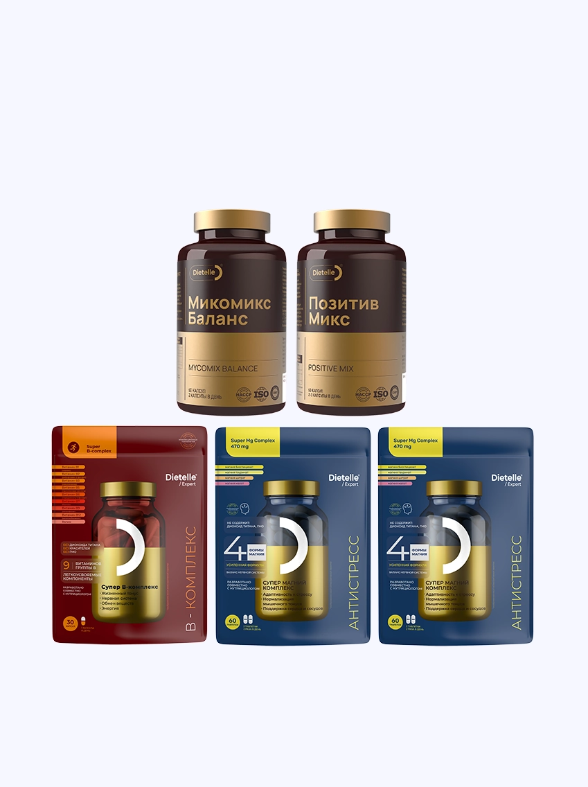 Комплекс содержит смесь органических грибов, растительные экстракты и витамины, которые помогают организму адаптироваться к стрессу, повышают концентрацию внимания и снимают нервное напряжение. Ультрализат пептидный Lactobacillus casei в составе комплекса поддерживает микрофлору кишечника, что положительно сказывается на настроении и интеллекте.