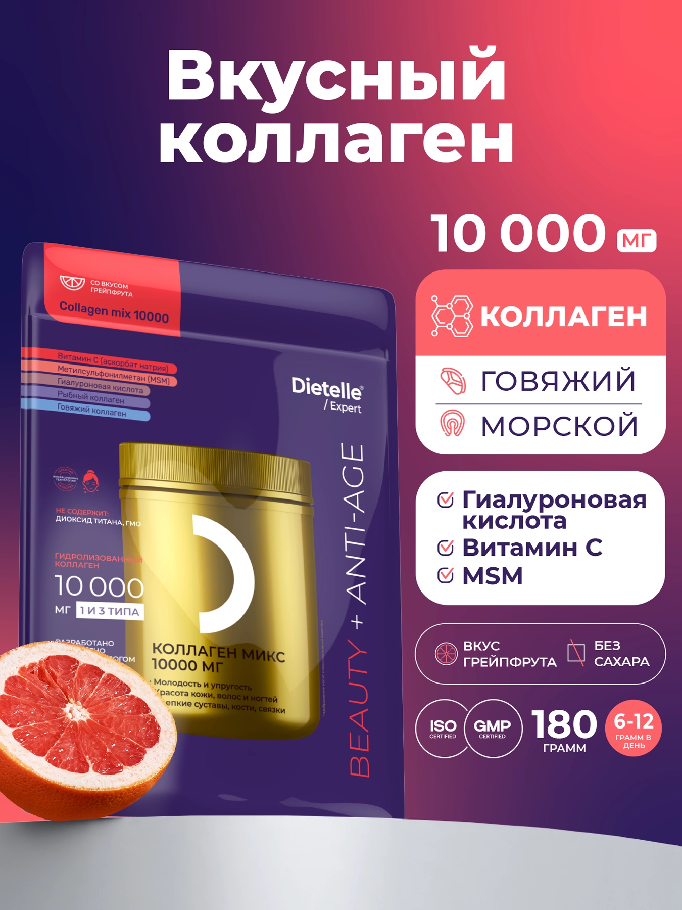 Коллаген Микс включает два вида коллагена (рыбный и говяжий), гиалуроновую кислоту, витамин С и MSM. Высокая дозировка обеспечивает увлажнение кожи, улучшает её эластичность и стимулирует выработку собственного коллагена.
