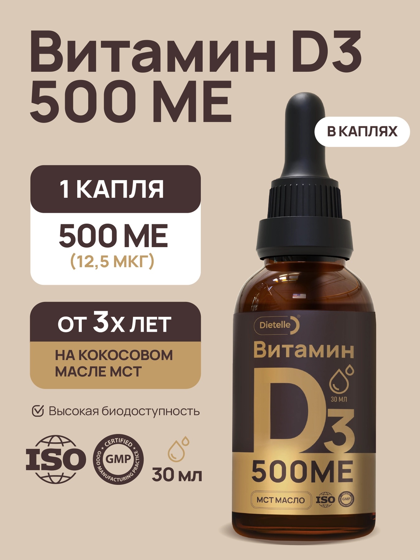 Это высокобиодоступная жидкая форма холекальциферола, разработанная для точной и мягкой коррекции уровня витамина D у взрослых и детей от 3х лет. Благодаря масляной основе на базе среднецепочечных триглицеридов (МСТ-масло), витамин легко усваивается даже при чувствительном пищеварении и не требует приёма с жирной пищей. Удобная дозировка — 500 МЕ в одной капле позволяет индивидуально подбирать суточную норму и точно следовать рекомендациям специалиста. Является надёжной поддержкой для иммунной защиты, стабильного настроения, а также здорового функционирования мышц и нервной системы.