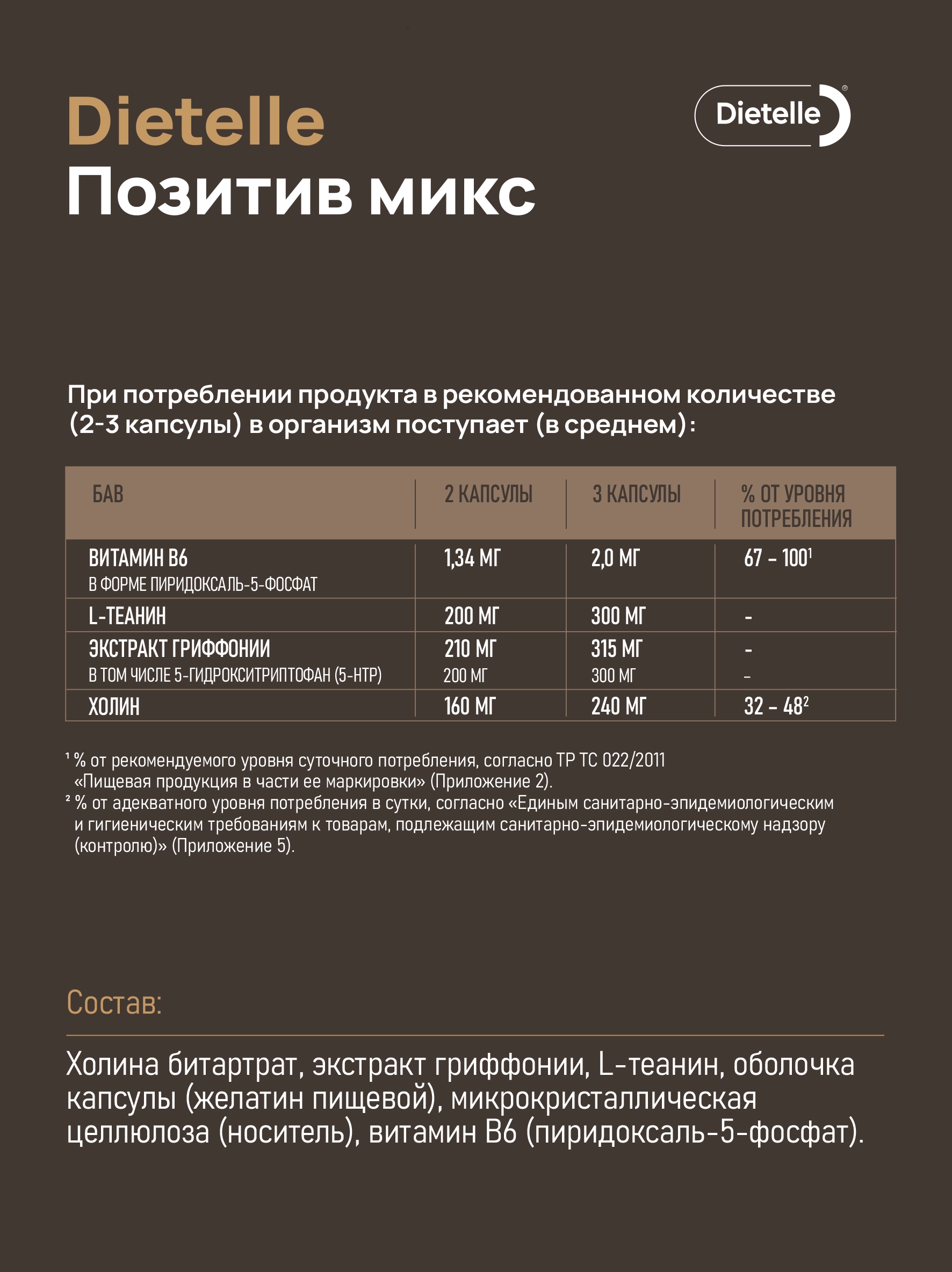 Помогает улучшить настроение, снизить тревожность и повысить качество сна. 5-HTP, L-теанин и витамин B6 в составе способствуют выработке серотонина – гормона счастья, а холин улучшает когнитивные функции.