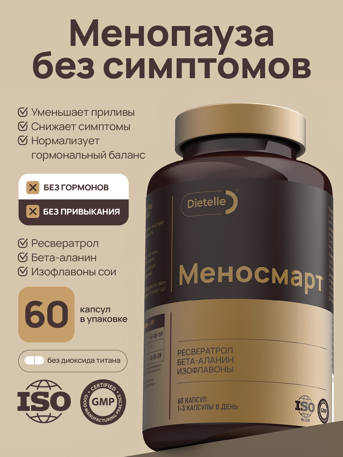Негормональный комплекс разработан специально для облегчения симптомов менопаузы. Бета-аланин в составе помогает снизить приливы, изофлавоны сои поддерживают гормональный баланс, а ресвератрол обладает мощными антиоксидантными свойствами.